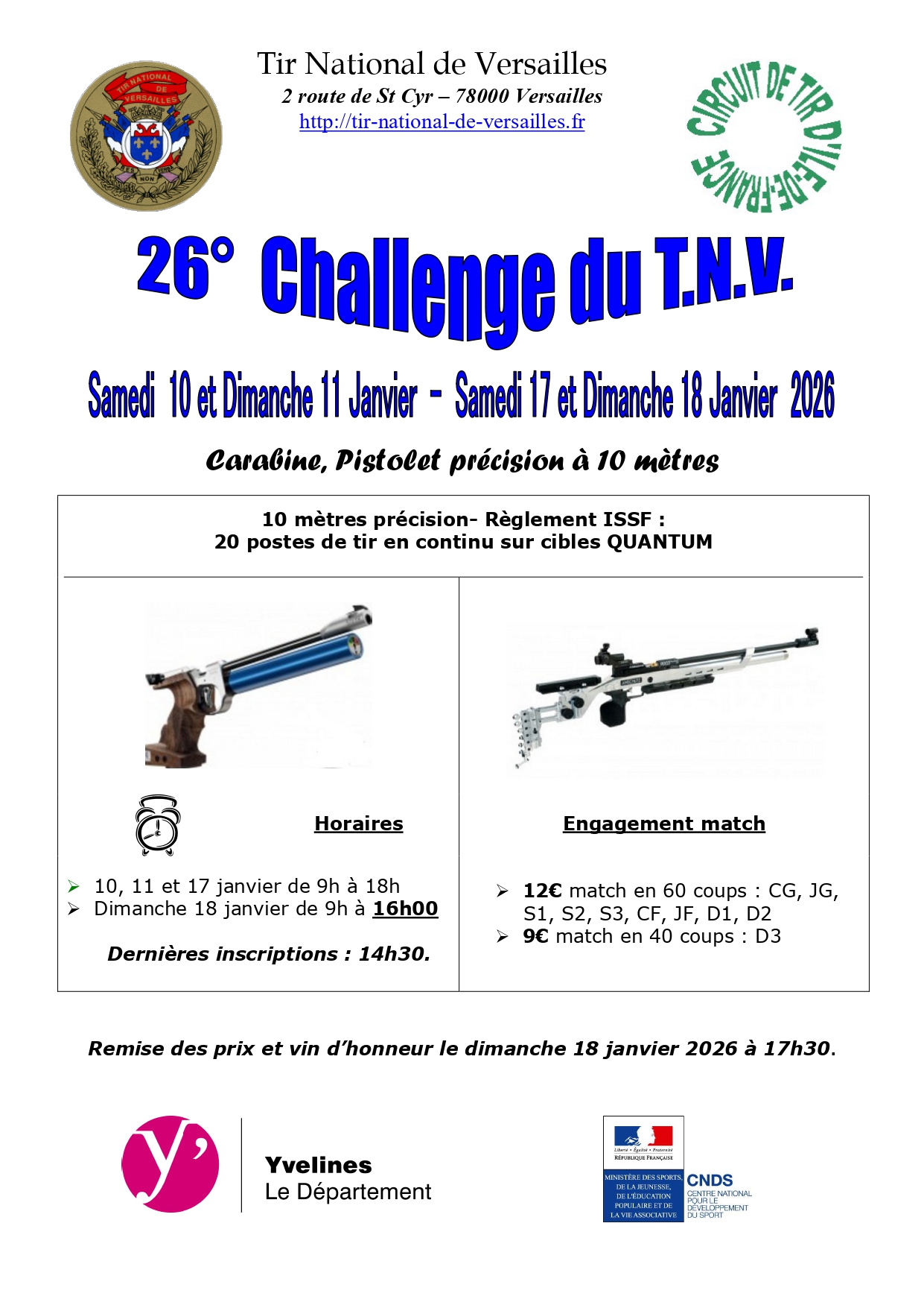 26e Challenge du T.N.V. – Janvier 2026 ven 5 Déc 2025 | Actualités, Matchs Amicaux Le TNV vous invite à son 26e challenge 10m (épreuves comptant pour le CIDF) : 26e Challenge 10m - TNV Pour toutes questions, n’hésitez pas à envoyer un mail à compet.cdty@gmail.com