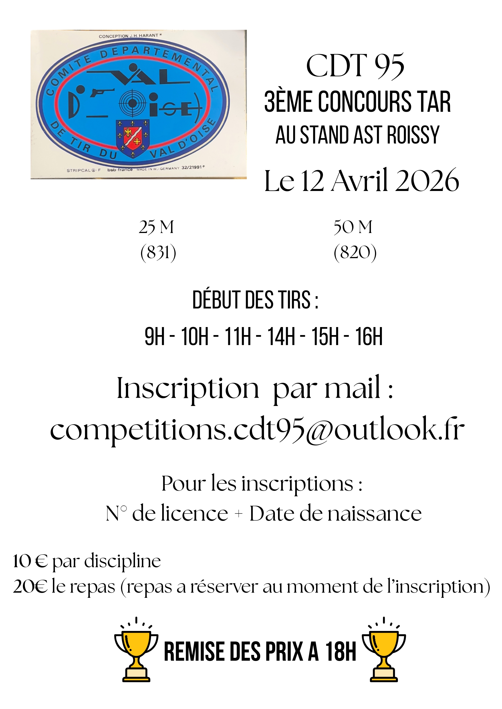 3e Concours T.A.R. mar 24 Fév 2026 | Actualités, Matchs Amicaux Le C.D.T. 95 organise son 3e concours T.A.R. (au stand de l’A.S.T. Roissy) : Concours TAR Pour tout renseignement, n’hésitez pas à contacter : competitions.cdt95@outlook.fr