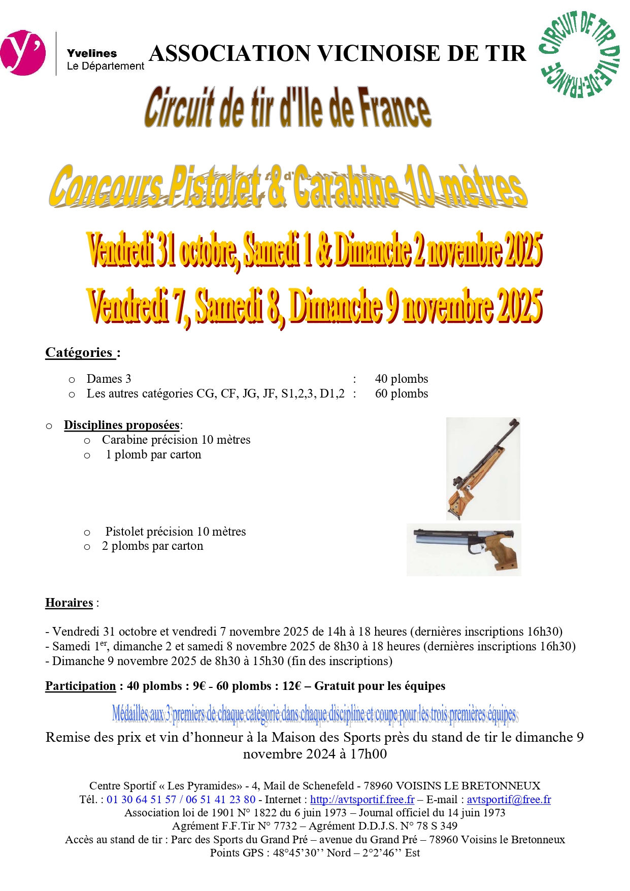 Concours Pistolet & Carabine 10m – Association Vicinoise de Tir lun 20 Oct 2025 | Matchs Amicaux L’Association Vicinoise de Tir organise un concours à 10m (épreuves comptant pour le CIDF) : CIDF - AVT Pour toutes questions, n’hésitez pas à envoyer un mail à avtsportif@free.fr